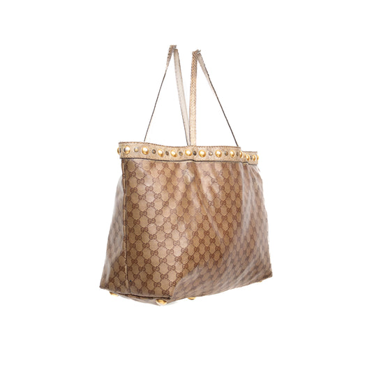 Authentic Gucci GG Monogram Canvas Tote Bag with Gold-Tone Studs and Snakeskin Trim