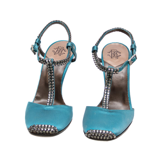 Roberto Cavalli Teal Satin Crystal Embellished Heels – Size 36 (US 6 / UK 3.5 / EU 36)