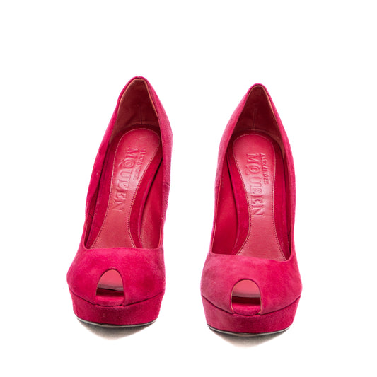 Alexander McQueen Fuchsia Suede Peep Toe Platform Heels – Size 37 (US 7 / UK 4 / EU 37)