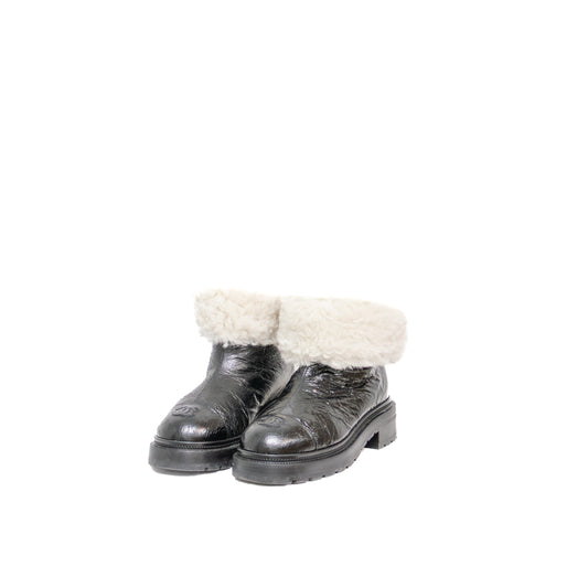Chanel Black Crackled Patent Leather Shearling-Lined Winter Boots – Size 36.5 C
