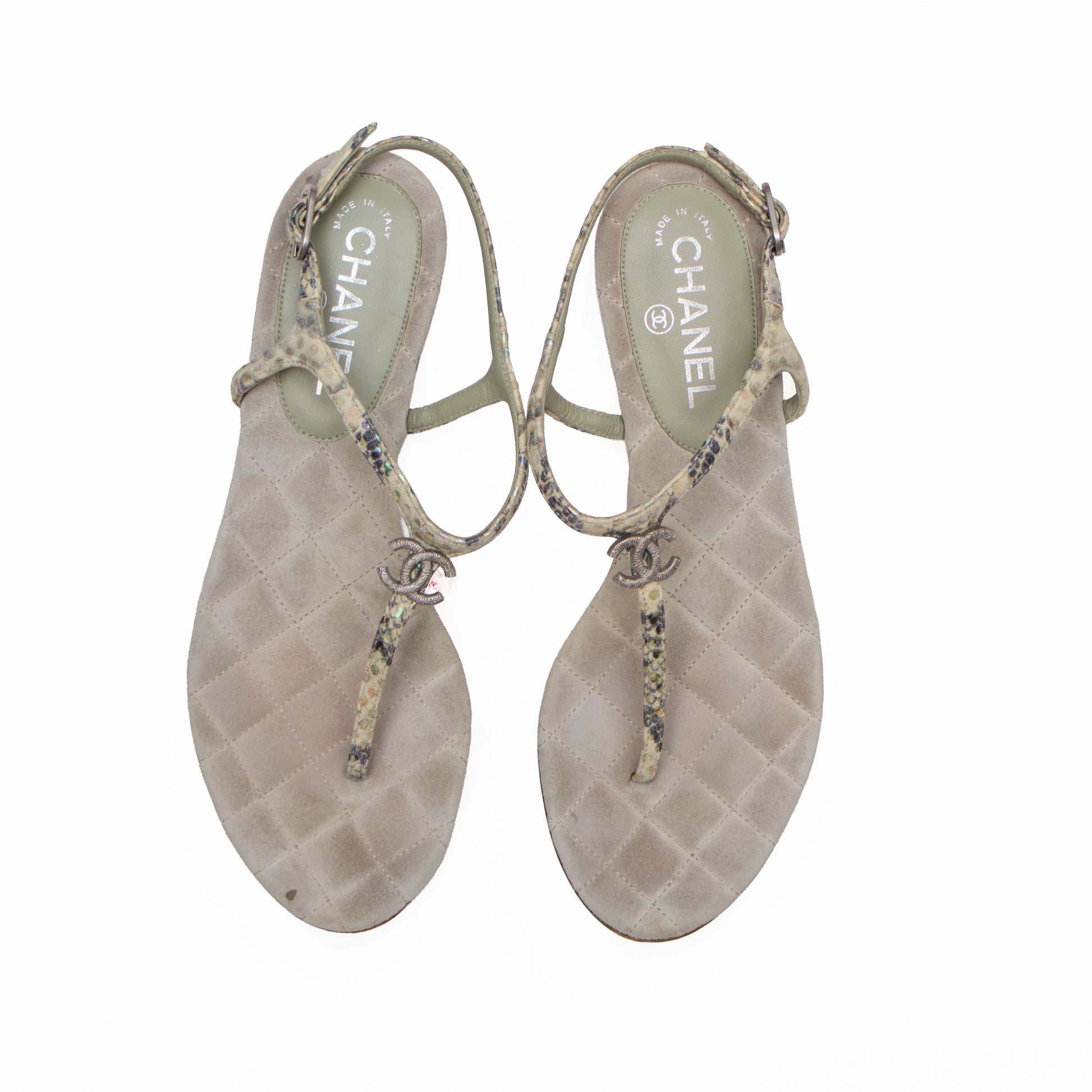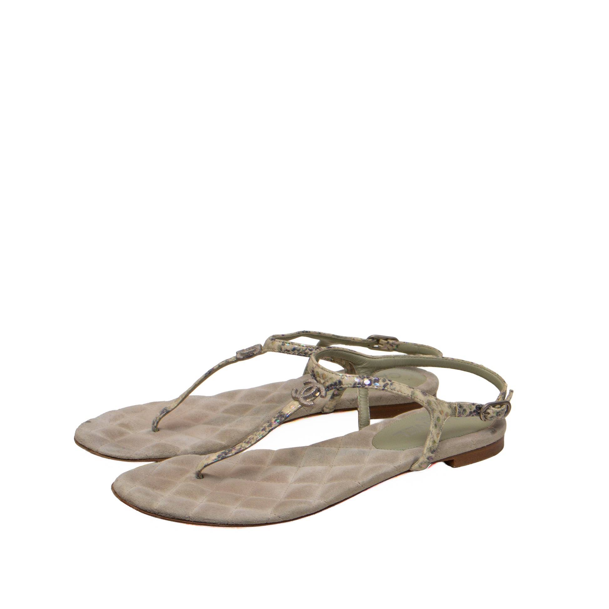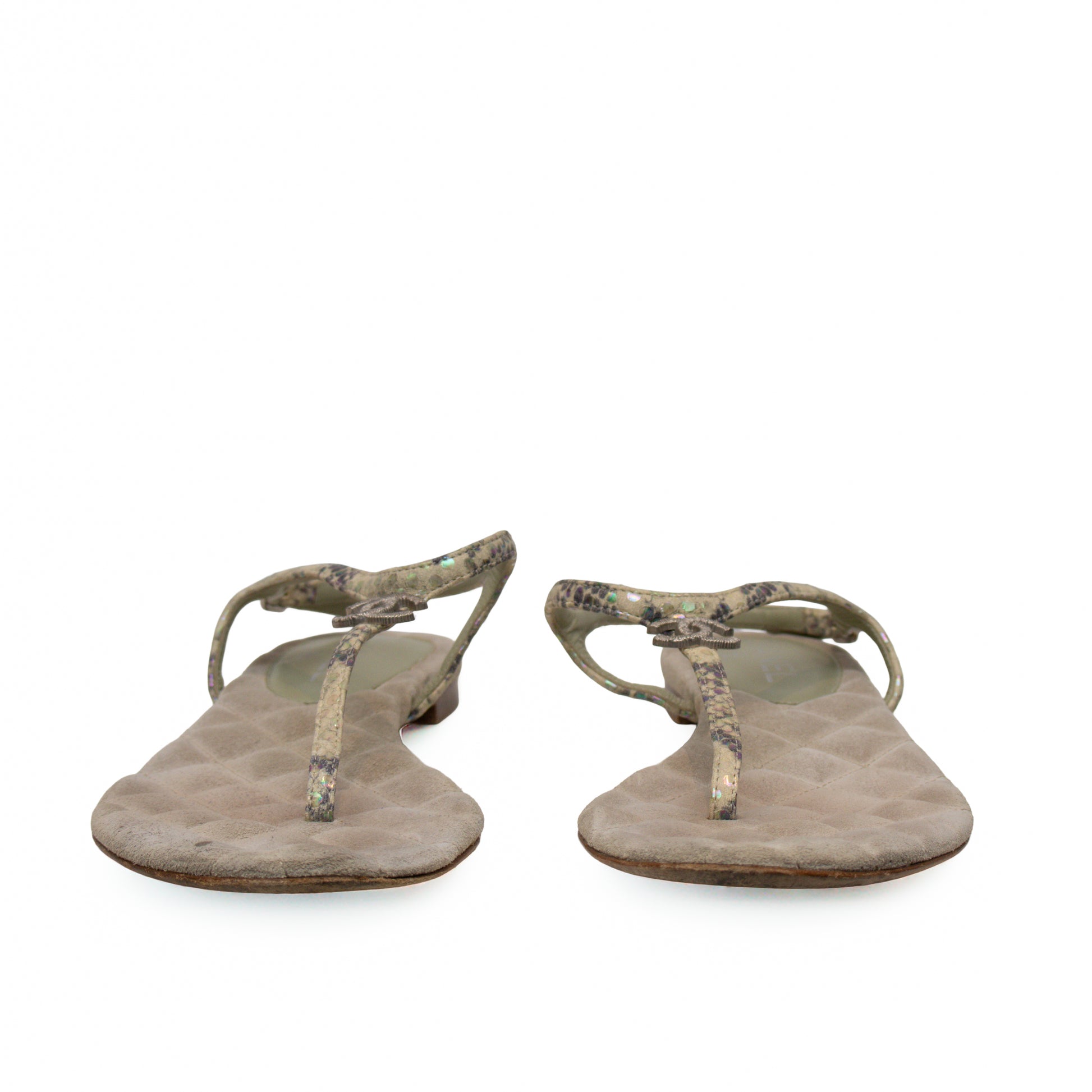 Add a touch of timeless luxury to your summer wardrobe with these authentic Chanel thong sandals, crafted in Italy with python-embossed green leather straps and Chanel’s iconic CC logo detail on the toe loop. The sandals feature a quilted suede insole for extra comfort and a refined, neutral tone perfect for versatile styling.