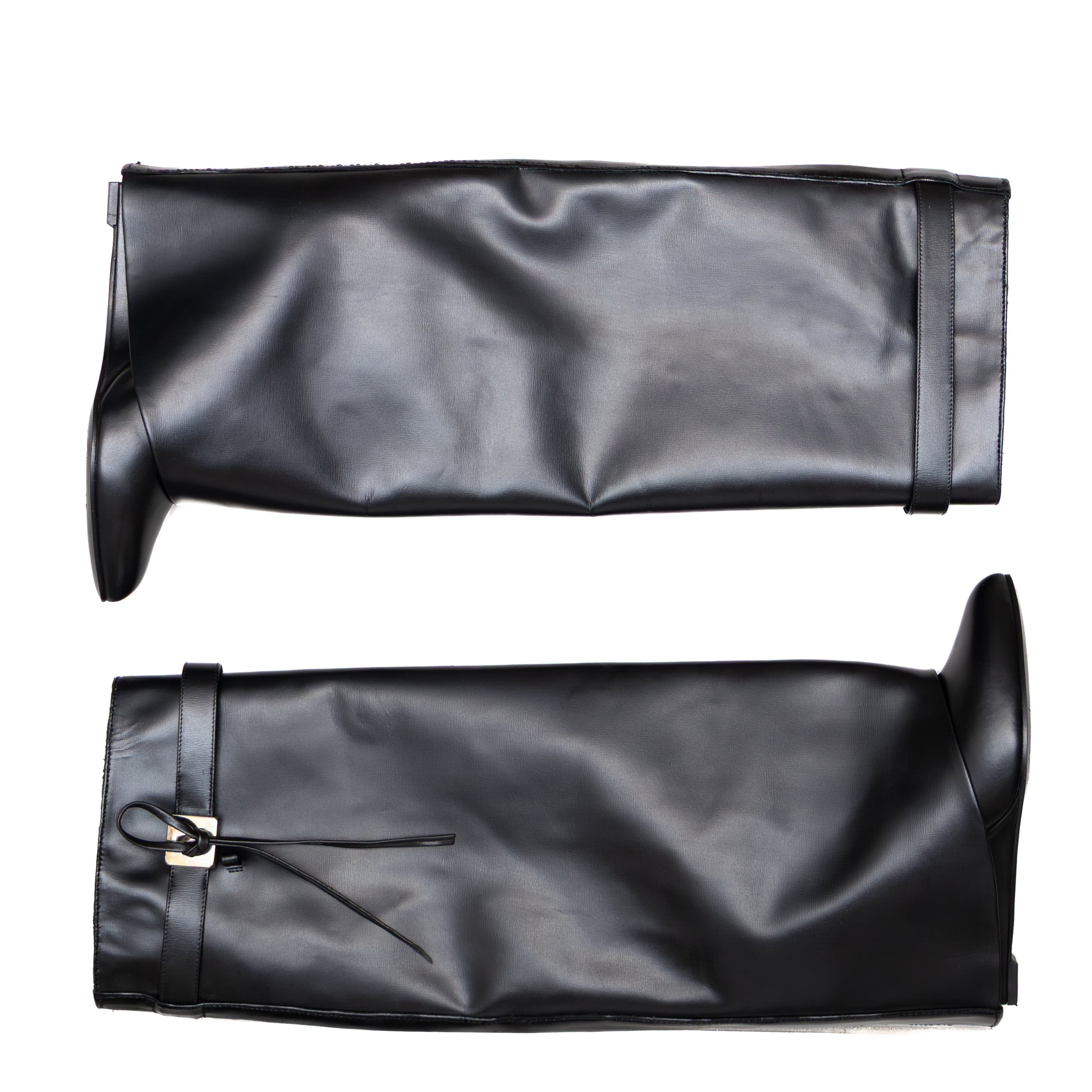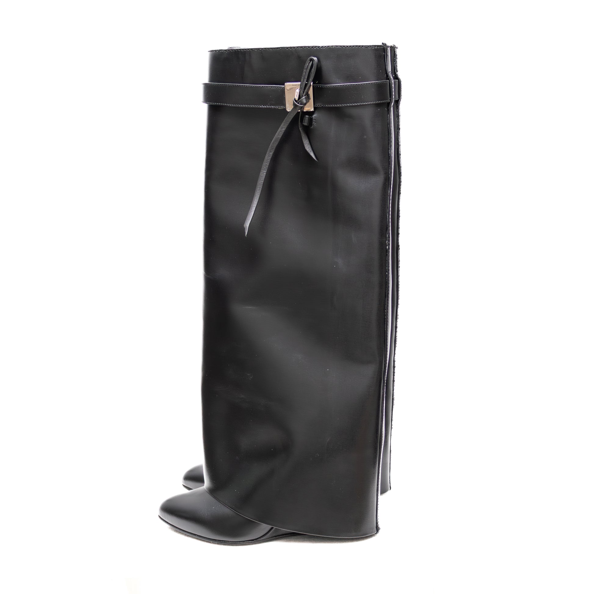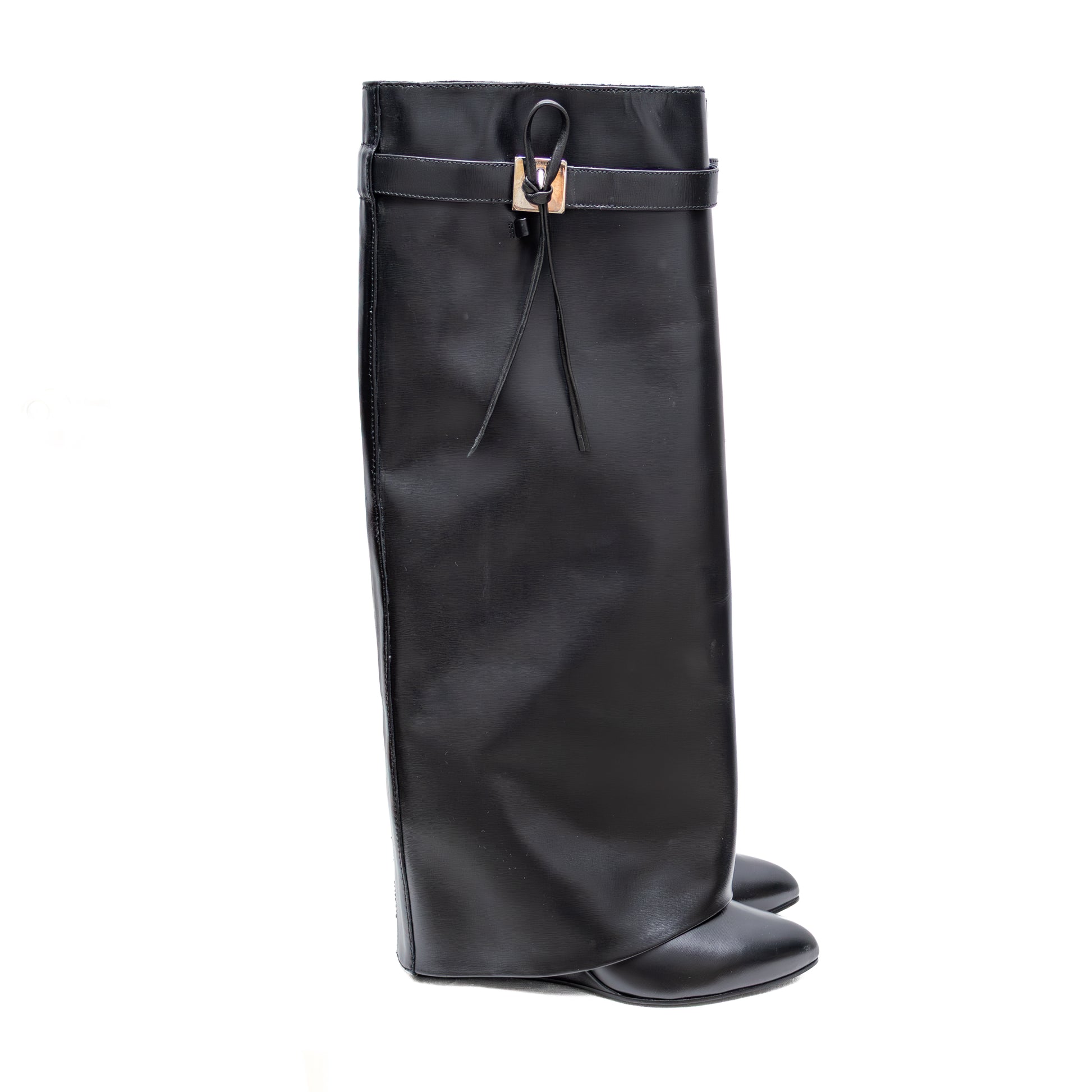 Own a pair of iconic Givenchy Shark Lock Boots, crafted in smooth black leather with a concealed wedge heel and signature silver-tone shark lock hardware. These boots are sleek, sculptural, and high fashion, featuring a belted wrap design and pull-on style. Worn only once, they remain in excellent pre-owned condition. Please note: the shaft appears professionally altered for a more tailored fit, and the boots run small — best suited for size EU 37–37.5 (US 6.5–7 / UK 4–4.5).