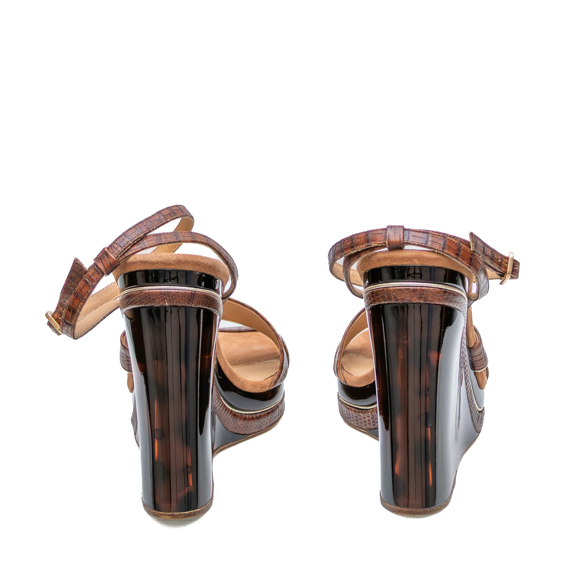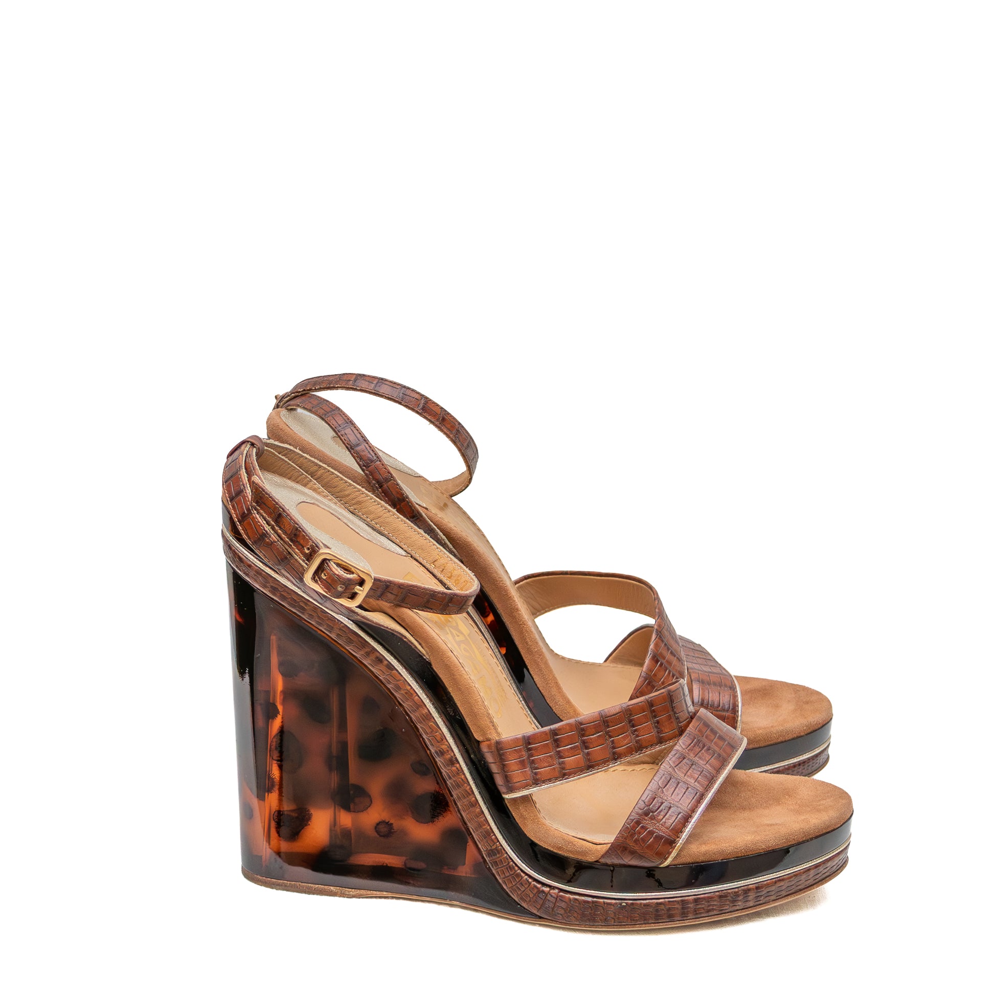 Salvatore Ferragamo Croc-Embossed Wedge Sandals – Tortoiseshell Lucite Platform – Size US 7